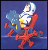 Some of the different Action Set combinations are: Billy in Snowsuit with Snowmobile Billy as an Astronaut with Lunar Crawler , Space Sled and Accessories Robbie Deluxe Grabber Space Vehicle Billy as a Fireman with Trucks and Accessories Billy as Pilot with Airplane Billy as Scuba Diver with Boat and Accessories Billy as a Construction Worker with Trucks and Accessories Walking Billy as an Astronaut with his Space Base Common accessories with these sets were red space sleds, yellow walkie-talkies and TV cameras. The Action Sets also came with a small comic that showed one of Billy's adventures and, of course, promoted other Billy Blastoff products, similar to the comics that came with Hasbro's GI Joe Adventure Team sets and the Marx Lone Ranger adventure disguises. There are some very rare carded accessory sets that compliment the Action Sets like the Scuba Scout pack which includes a camera, sea tow, mask and speargun or the Construction pack which contained a drill, spade and pebbles. Billy is hard to find today without cracks and in working condition. His friend Robbie is commonly missing his antenna. The Fireman and the Pilot are harder to find than the other figures. A good loose figure might set you back as much as $75 and complete playsets between $150 and $300. The Accessory Packs can bring up to $75.