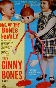 Marx promoted Ginny Bones as your "real posin' pal". The images on the box show a human boy and girl hanging out with their freshly assembled Ginny, and the back of the box shows Ginny sitting on a park bench with the girl and later, taking a ride in a wagon. Those were some brave kids because Ginny would have scared the hell out of me on Christmas morning. Skinny Bones, Ginny's brother, was another member of the bones family. He was essentially packaged the same (was he made from Ginny's rib?) except that he had the head of a boy. Skinny is even harder to find than the elusive Ginny. The boxes for Ginny and Skinny depict 2 Bones Family animals. Skinny has a horse (name unknown) and Ginny has a dog named Ham Bones. These two critters are even harder to find than Skinny Bones but, like Skinny, usually sell for well under $100.