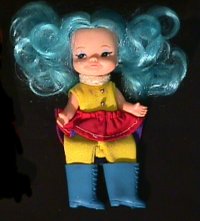 Adventure Boy had several action sets including a space set with Adventure Boy as an astronaut with space ship and a sports set with skate board and snowmobile. If these leaping-lovelies and lads weren't hip enough, Remco released the hard-to-find Pebbles from the Flintstones, The Monkees and Action Boy in 1970. Now you could make your favorite guitar-posing popsters run from girls, jump into convertibles and do David Lee Roth-kicks on stage. Adventure Boy (a Superboy wannabe) runs with his cape flapping, leaps into his Skymobile to streak to the next crime scene and as Remco boasts, it requires no batteries! Adventure Boy also took to the moon with his space craft and white space-suit, leapt on his motorcycle in green suit and yellow helmet and tore through the snow with his snowmobile in his red and yellow snowsuit and helmet. As you can imagine, the tights that your fingers fit into to took quite a beating. Splits in the tights or in the boots are quite common in loose Finger Dings. It's also not unusual for the boots to be missing altogether. You can find the first series of Finger Dings, even boxed, for well under $20. The pre-fab four sell individually for a bit more, usually $20-$35. The Adventure Boy sets can run as much as $75.