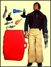 Jay was sold in a window box. He was vinyl, 10-inches tall with Captain Actionesque articulation. In fact, I have heard that he uses the same body style as Action Boy. He came dressed in pants, a sweater and vest marked JJ, and boots. His molded hair covers the upper part of his ears as was the fashion in 1976. Jay wasn't the only Ideal action figure to use Captain Action's body. Electroman and the Star Team Knight of Darkness both had the same body types and are frequently used to complete Captain Actions with missing body parts. Instead of hands, Jay James Armes had clever accessories that let him use his "hands" as tools and weapons. These pieces were stored in a red briefcase. The contents of the case were: 2 suction cups for climbing walls a magnet for hanging onto steel structures a machete to cut his way out of tough situations a pair of false hands for undercover roles a hook that converts to a pistol a pair of spring loaded hooks |