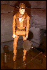 Instead of G. I. Joe's nude mannequin figure with removable cloth uniforms, Marx relied on their state-of-the-art use of plastic injection molding to manufacture a highly detailed scale replica of an American combat paratrooper, circa 1942, with his fatigues molded to the body and issued with over 70 pieces of scaled-down authentic personal military gear. This product would most likely have hit store shelves in late 1964, as the figure shown in the Marx trade catalog released early that year showed an obvious prototype mock-up that looked very little like the finished product. One flaw on the final 1964 release- Stony's legs didn't move! The objective seems to have been to undercut Hasbro's price and steal some of their market potential, and it probably worked to a certain degree. However, most of us will readily look back and think "Stony who?" This Marx soldier didn't even come close to achieving the 1960's icon status that Hasbro's G. I. Joe did (although some "Joe" connoisseurs are said to prefer the exacting scale and detailing of the many Marx weapons & gear pieces to those provided by Hasbro). The competitive Marx company must have acknowledged this fact early on, and decided that if they were going to really be able to compete with Hasbro in the action figure market they would have to take a different approach. With the 1950's popularity of TV westerns carrying over into the 1960's, and continuing success of shows like "Gunsmoke" and "Bonanza," Marx keyed in on a pop-culture theme that had been going strong for decades. As soon as Stony had left the Marx 'barracks,' the "Heroes of the West" were being readied for debut. A 12" cowboy action figure named JOHNNY WEST along with counterpart Indian CHIEF CHEROKEE were given 1965 marketing priority and appeared prominently on the cover of the Marx promotional catalog for that year. They were joined by THUNDERBOLT, the western range horse that both could ride. Surely, this meant that the figures' legs would have to move, and both cowboy and Indian were issued with FULL eleven-point articulation. Stony Smith was also upgraded this year to include movable hip & knee joints, but one oddity remained: shown for the first time in the 1965 Marx catalog (but probably available to retailers for the 1964 Christmas season) was a 12" DANIEL BOONE figure using the NON-articulating leg engineering. This figure was an obvious, but unofficial, tie-in to the "Daniel Boone" TV series starring Fess Parker. Daniel, like Davy Crockett a decade before "was a big man" in the ratings, and evidently a very popular toy issue for Marx considering the number present in today's market. But, there's no indication that they ever produced this figure with moving legs. (?) Having gained the foothold as industry provider of western genre action figures (while Hasbro dominated the military figure market), Marx began immediately expanding the line. 1966 brought Johnny's cowgirl partner JANE WEST to the scene, and another horse named FLAME (molded in an 'action' running pose, but still non-articulated). The company also brazenly imitated Hasbro with the release of the ALL AMERICAN FIGHTER, a.k.a. BUDDY CHARLIE, a modern military figure that was presented in a uniform typical for each branch of the service; Army combat soldier in olive drab fatigues, Navy sailor in blues, Air Force airman in orange coveralls, and Marine in camo fatigues. This was essentially a knockof f of the GI Joe body style clothed in uniforms made for Marx in Hong Kong, with the one improvement being pliable, life-like 'grasping' hands (cast in vinyl) that Marx had used since first deploying Stony. Again, no dent in Joe's helmet, as far as sales were concerned. 1966 also saw the release of a pair of Secret Agent action figures: MIKE HAZARD DOUBLE AGENT, and the only officially licensed media character MGM's GIRL FROM U.N.C.L.E.. Mike has molded body of dark blue civilian dress clothes, but was augmented with a beige fabric trench coat (HK mfd.) tailored with numerous secret pockets. This double agent, with his permanently molded-on smug grin, has an arsenal worthy of the best of spies: exploding attache' case, working rocket launcher, tear gas pen, radio with concealed machine gun, along with enough other weapons and disguises (60 pieces in all!) to get him out of ANY jam. And consider this to show what a difference 30 years make- Mike was issued with a pack of cigarettes & a lighter.