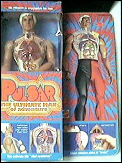 Pulsar, the hero, had a clear chest with realistic internal organs, much like the Visible Man model. Here is the cool part: press his back and blood starts running through his veins, his lungs breath and his hear beats. GI Joe couldn't do that no matter how much of a knock-out the GI Nurse was. Pulsar also came with a pair of Mission Disks that you could insert into his computer brain which was hidden behind his removable face. Hypnos, an alien, also had a removeable face mask and a sparking, noisy hypnotic wheel in his chest. The only other item in the line was the Life Systems Center. The center was essentially a wall which allowed you to strap in Pulsar and light scan his brain, activate vital organs and program him for missions. In, 1979 Mattel made a large Bat named Gre-Gory that also had the blood pumping mechanisim featured in Pulsar.