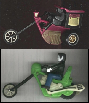 Ideal's Scare Cycles are the Reece's Peanut Butter Cups that bring these people together. Made in 1978, these choppers are manned by ghouls! Each bike is about 8-inches long with glow-in-the-dark features and are driven by rear friction-wheels. The monsters are unarticulated and are removable. The only riders I have found so far are The Grim Reaper and Frankenstein. The Grim Reaper's bike has 3 wheels while Frankenstein's bike is the traditional 2-wheeler. I do not know if these were the only two creatures made or if the balance are just very hard to find. The latter may be true as information on these seem to be as scarce as the bikes themselves.
