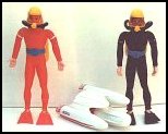 There were two basic frogmen, Commander Carter and Rick Riley, that each came with oxygen tanks, fins, hoses, face mask, helmet, battery-powered sea sled and pump. Some of these pieces were actually reissues of some of Major Matt Mason's equipment. The pump would cause the figure to dive and resurface. The Search and Rescue set came with an Aqualander, a land and sea vehicle.