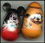 The genesis of these little toys that wobbled but never fell down was actually the Romper Room Punching Clown -- Weebles are tiny plastic versions of "bop-bags". The first version of the Weebles was a fatter, squatter family than most Weebles people remember. They were "peelable", with the litho uncoverd and easily scraped. Within a year, the Weebles were improved and all new packages touted the Weebles as "Improved Peel Proof Weeble". The original family was a dark-haired father with a red shirt or blue v-neck sweater, a blond-haired mother in a green dress, a boy in blue jeans and a white "W" tee, and a red haired girl with green pants. There was a brown family dog, too. A baby was soon added to this line-up; she was pink and held a blue balloon. The treehouse and cottage followed in 1973. The Weebles popularity grew with the line. Soon the Weebles family had its own vehicles, a boat (the S.S. Lilleputt), a playground (swings, slide, and merry-go-round), pop-up camper/trailer, train, marina, airport and plane (a plane was also included in the Weekender set), haunted house (with scared girl, boy, witch and glow-in-the-dark ghost), blimp (with pilot), circus (with Wobbles the clown, Gina the trapeeze artist, and Bert the Ringmaster), race-track (with Weebles numbered 1-4), and a submarine (with diver). Some of the most rare vehicles include the dairy truck (not sure what the Weeble looks like that came with this one) and firebrigade truck with firefighter. Disney got into the Weeble mania and approved the production of the Magic Kingdom set, the Mickey Mouse Clubhouse set, a Winnie the Pooh treehouse, a Winnie the Pooh cottage, and a Winnie the Pooh circus. The Disney weebles include: Mickey Mouse, Billy and Karen the Mouseketeers, Donald Duck, Goofy (in two forms), Pooh, Tigger, and Christopher Robin. From literature, the Weebles sprang up in a Treasure Island set (complete with pirate ship and four pirate Weebles) and another version of the treehouse for Tarzan and his ape friend. The Wild West had its own Weeble line -- The Weeble West Ranch, a Western Train, the Wagonmaster, and Indian Wigwam sets. The wagonmaster is larger than the cowboy girl and boy and Indian girl and boy from these sets. Holiday Weebles were produced in carded sets of two: Christmas had Santa and Rudolph; Easter had a bunny and chick dressed in their Sunday best. For Halloween, you could find the glow-in-the -dark ghost in his purple ghost van, or buy a SuperWeeble -- his back is opaque and when you turn him he becomes a mild-mannered ice-cream truck driver, with his super-identity cleverly hidden! He came with an ice-cream truck and his nemesis was a black-haired fellow known as Mr. Trouble, who carried a bomb in his back pocket. The Flintstones family and Raggedy Ann and Andy were carded sets as well. Tumblin' Weebles came in 1978 as a variation on the standard Weeble. The weight was free to fall into the larger head so that, on an incline, the little guys sommersaulted down. A fun house and a few other sets were produced. The last of the Weebles were the Sesame Street crew, in the early 80s. These include: Big Bird and plane, Ernie and Helicopter, Cookie Monster and Sailboat, Bert and convertible, and Oscar, plus a Sesame Street playground. Other Weebles merchandise included puzzles, a big bop bag, and jewelry (you could wear a charm necklace of your favorite weeble to school!) The Weebles also had a big following overseas in Japan. You can occasionally find these sets in their foreign boxes. Some paint variations from the U.S. versions do exist. |